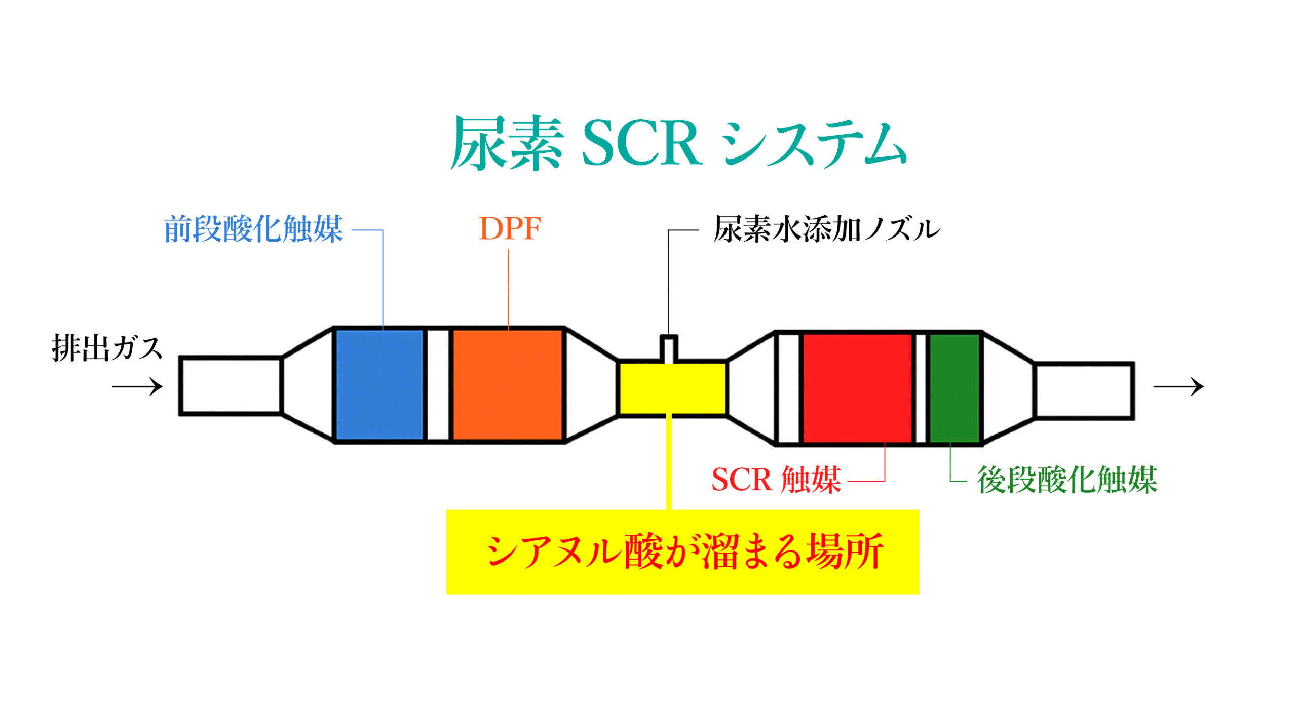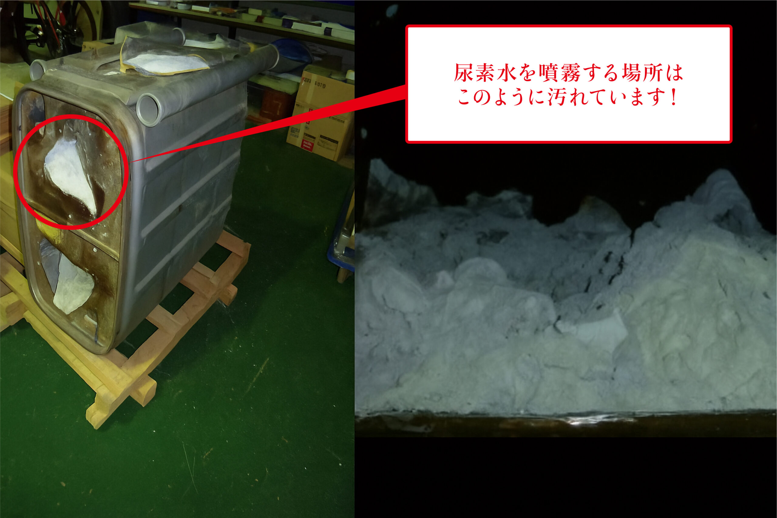 他社製の尿素水を使用したマフラーから検出された、白く硬い堆積物――